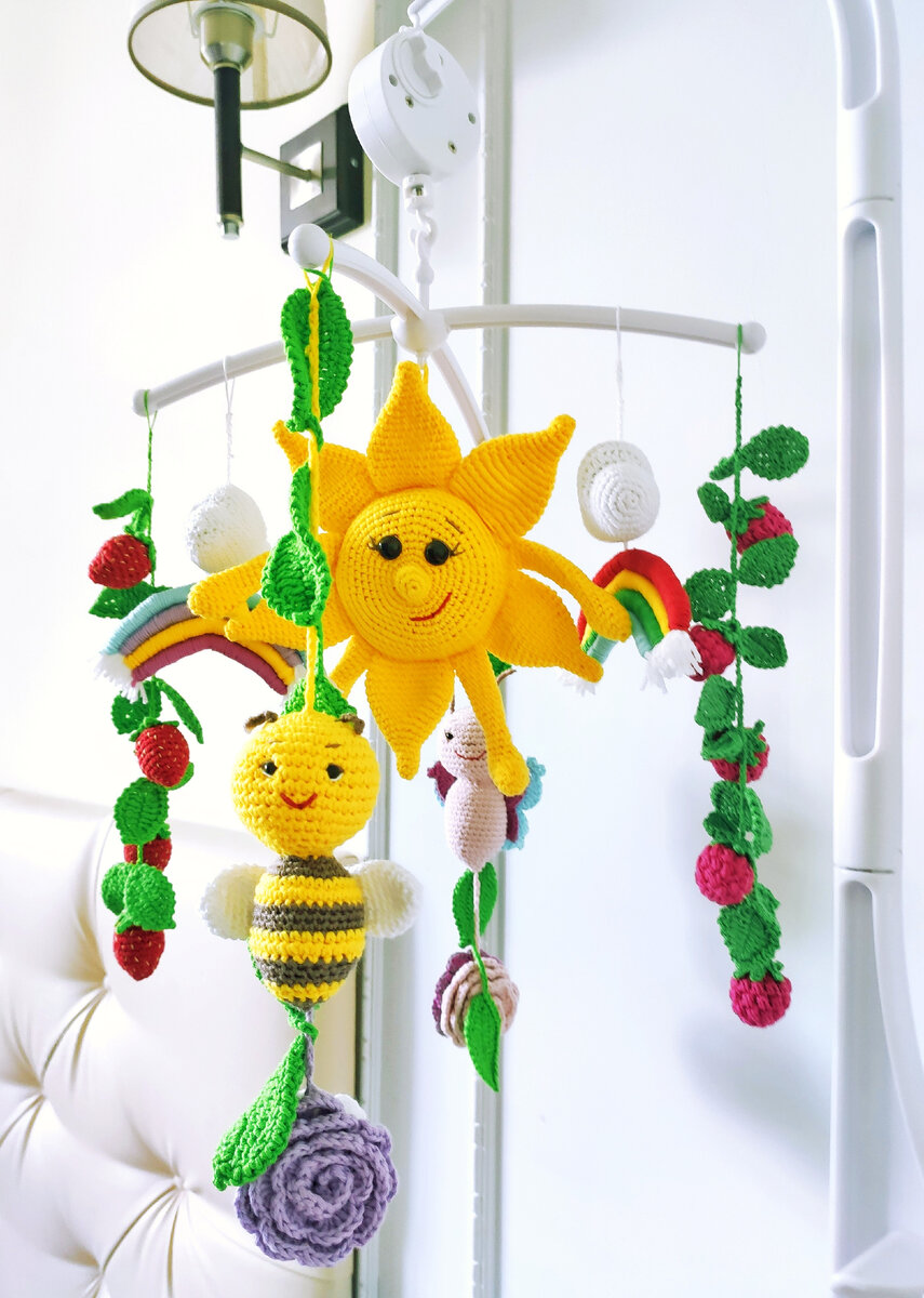 🌞 Друзья, хочу показать вам свою новую работу - детский мобиль, который я придумала и связала для новорожденной дочки близкой подруги 🌞 Обдумывала очень долго, мне хотелось добиться максимального позитива - солнышко ☀️, цветы🌸, пчёлка 🐝 и бабочка🦋, ну а также куда без моих любимых ягод🍓 и листочков🌿 🌞 Все детали я повесила на основу для мобиля, которая и крутится и играет волшебную музыку ♥️ Любовь и радость в каждой петельке! Готовлю большой Мастер класс по вязанию такого мобиля, который будет содержать максимально подробное описание каждого элемента, по рядам, с описанием всего процесса и, конечно, пошаговые фото‼️ ✍🏻 Присылайте ваши заявки на МК‼️ 🔥🔥🔥 Первые заявки получат описание по специальной цене🔥