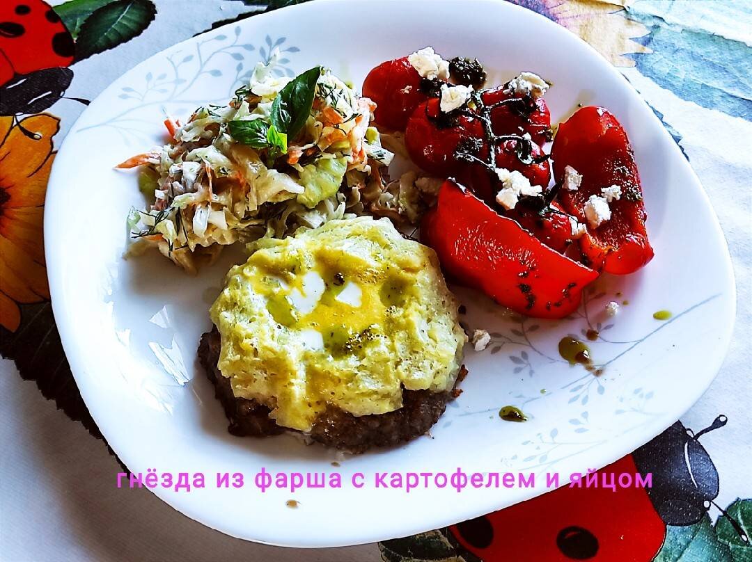 #летнееменю Сытное вкусное блюдо. Полноценный обед или ужин с гарниром салат коул слоу и запечёнными овощами. Ингредиенты: фарш (говядина+свинина), картофель, яйца, топленого масла, растительного масла, сыра, Запечённые овощи:, томаты черри, перец болгарский, Заправка: , растительное масло, соль, сахар , зелень, вустерширский соус , сливочный сыр , базилика Способ приготовления: Картофель чистим,моем,разрезаем пополам и отвариваем в подсоленной воде до готовности. Остужаем и превращаем в пюре с помощью толкушки.На тёрке трём сыр,какой есть, (моцарелла, плавкий). Добавляем топлёное масло и сыр перемешиваем всё, получается густое пюре. Выстилаем пергаментом, противень смазываем раст. маслом. Из фарша катаем шарики и делаем лепешку, в центр кладём начинку из картофельного пюре и в разогретую духовку до 180 гр. на 20 минут. И в духовку на 10 минут, вместе с овощами. За это время приготовиться блюдо и запечённые овощи на гарнир. Вынимаем из духовки и сервируем. Помидоры черри кладём в форму