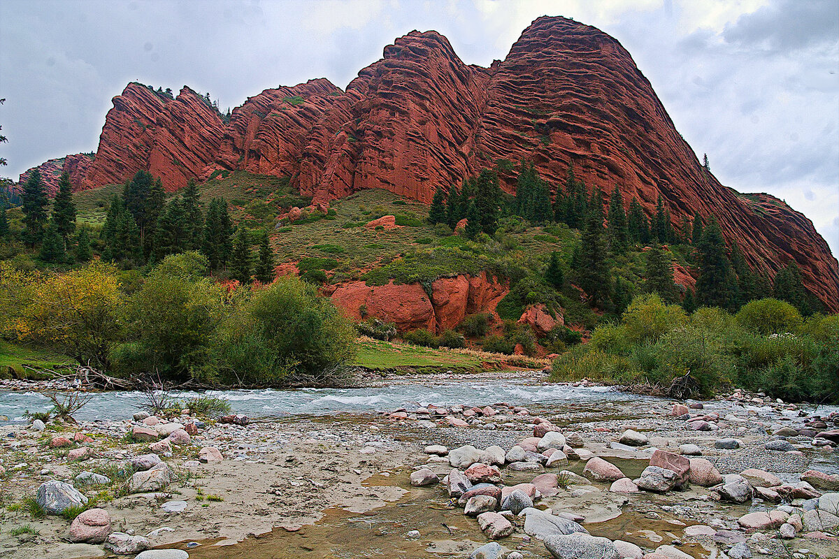 Он находится на южном берегу Иссык-Куля — одного из крупнейших горных озер в мире. Красно-желтые почвы образуют причудливые фигуры, которые
