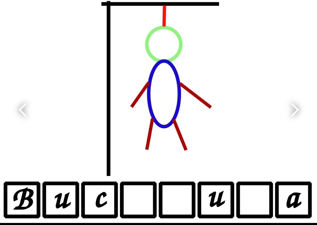 Печатники на газетке с курицей... Хватит веселиться.. На Мировой карте... Не смешно уже.. 😡 Ви́селица (также «Балда») — игра на бумаге для двух (или больше) человек. изображение игры виселица ПРИНЦ ип игры. 😝 Один из игроков загадывает слово — пишет на бумаге любые две буквы слова и отмечает места для остальных букв, например чертами (существует также вариант, когда изначально все буквы слова неизвестны). Также рисуется виселица с пеТЛей. Согласно традиции русских лингвистических игр, слово должно быть именем существительным, нарицательным в именительном падеже единственного числа, либо множественного числа при отсутствии у слова формы единственного числа. Второй игрок предлагает букву, которая может входить в это слово. Если такая буква есть в слове, то первый игрок пишет её над соответствующими этой букве чертами — столько раз, сколько она встречается в слове. Если такой буквы нет, то к виселице добавляется круг в петле, изображающий голову. Второй игрок продолжает отгадывать бук