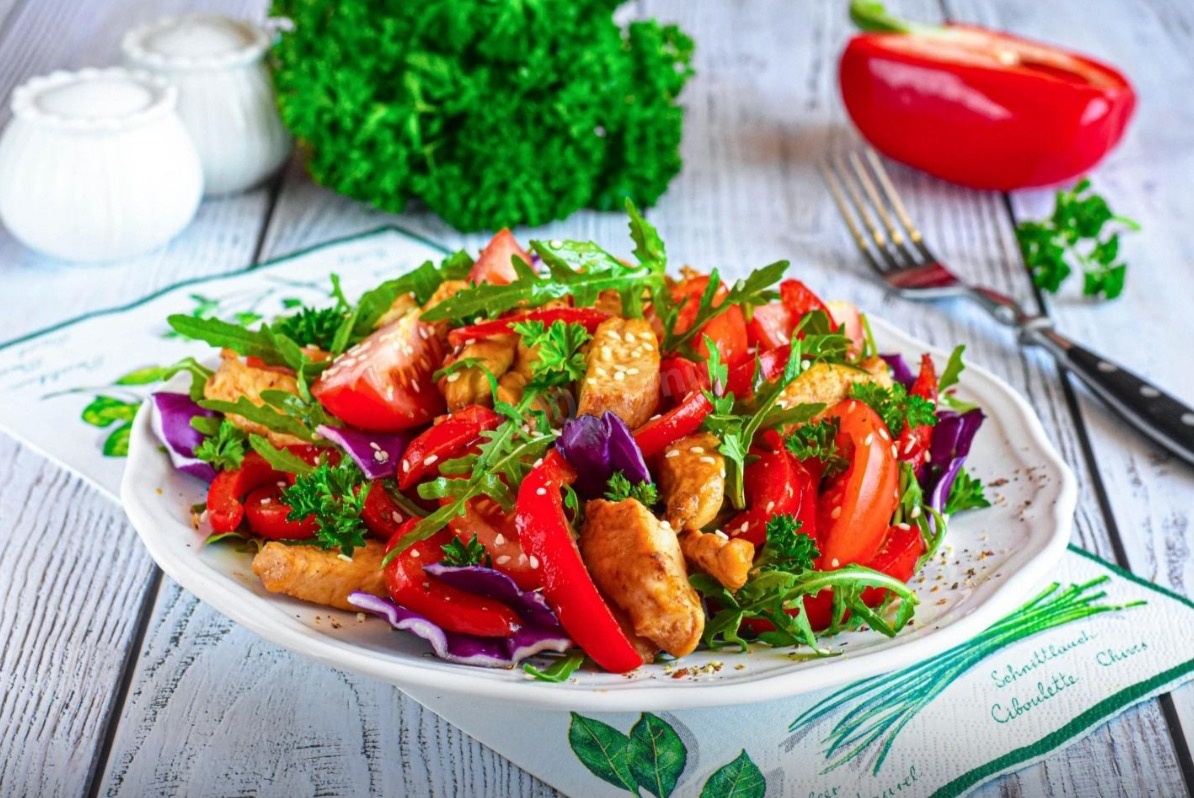 Такого салата вы ещё не пробовали, рецепт был передан нам шеф-поваром одного из лучших ресторанов Мексики. 1. Возьмите куриное филе, один болгарский перец, помидоры, перец, листья салата(один пучок), укроп, соевый соус. 2. Болгарский перец очистите от семян и нарежьте соломкой.  3. Нарежьте дольками помидоры.  4. Помойте и обсушите листья салата, по желанию можно использовать пекинскую капусту, смесь рукколы с радиччо.  5. Нарежьте куриное филе тонкими брусочками, выложите в миску, залейте соевым соусом, оставьте мориноваться на 20 - 30 минут.  6. Выложите курицу вместе с маринадом в сковородку разагретую на сильном огне. Спустя 5 минут добавьте перец, обжарьте на среднем огне ещё 3 - 5 минут. Не забывайте помешивать.  7. На тарелку выложите салатные листья, прямо на них со сковороды разложите курицу с перцем, наверх положите дольки помидоров. По желанию можно посыпать кунжутом. Полете салат оставшимся растительным маслом. Солить не нужно - соевый соус замечат