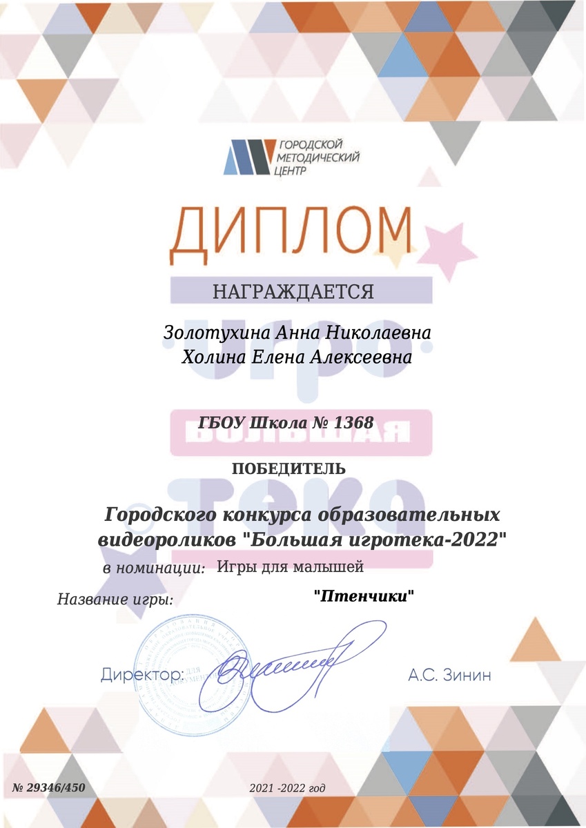 Подведены итоги Городского конкурса образовательных видеороликов «Большая игротека — 2022». В этом году он проходил в номинациях: «Игры с мячом» и «Игры для малышей». Оценка конкурсных материалов проводилась городским жюри по следующим показателям: оригинальность содержания игры, практическая значимость и новизна, доступное описание правил игры, соответствие возрастным особенностям детей и техническим требованиям. Поздравляем ребят и педагогов образовательных площадок дошкольного образования, которые приняли участие в конкурсе и стали призерами и победителями: Золотухина Анна Николаевна и Холина Елена Алексеевна - победители в номинации «Игры для малышей». Ильина Марина Валерьевна, Максимова Наталья Юрьевна и Голубкина Наталья Владимировна - победители в номинации «Игры с мячом». Романенко Оксана Сергеевна и Сахипгараева Надежда Владимировна - призеры в номинации «Игры с мячом». Блестящий результат и достойное участие! Видео-ролики можно посмотреть в нашей официальной группе ВКонтакте