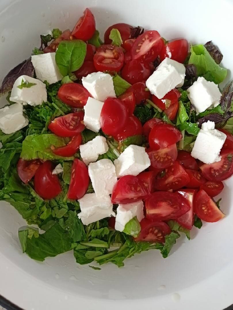 Вкусный , лёгкий, ароматный, диетический салат . Готовится салат очень быстро . Ингредиенты: Листья салата, Руколла, Базилик, Лук репчатый (средняя головка), Помидоры черри , Брынза, Масло оливковое (или растительное), Соль Способ приготовления: Промываем под проточной водой зелень салата, руколлу, базилик. Черри моем и нарезам на две дольки. Лук почистить от шелухи и нарезаем крупно. Крупно режем зелень салата, руколлу, базилик, добавляем нарезанные помидоры, лук и брынзу. Солим, заправляем маслом и салат готов. Вкусный лёгкий и ароматный. Приятного аппетита 😋.