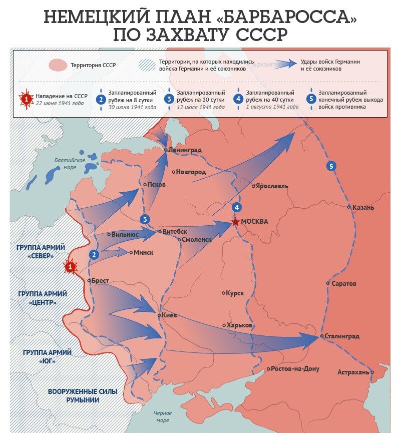 Предыстория боевых действий 18 декабря 1940 года гитлер утвердил директиву №21, известную всем, как "план Барбаросса". Думаю, вы прекрасно знаете, что предпологалось в этом плане: начать стремительное продвижение и быстро разбить соединения Красной Армии. Общая цель звучала так: отгородиться от азиатской России по общей линии Архангельск-Волга. Оттуда авиация могла уничтожить оставшиеся военные базы Советского союза. Завершение операции планировалось через три-четыре месяца. Подготовка к нападению была закончена к середине июня. Ночью 22 июня В.Г.Деканозова, посла СССР в Германии, срочно вызвали в Имперское Министерство Иностранных дел Германиии. В 3 часа ночи, по берлинскому времени, вручили документ: "Нота министерства иностранных дел Германии Советскому правительству". Одновременно такой же документ в 5 часов ночи, по московскому времени, получил Молотов из рук германского посла в СССР. Советский Союз обвинялся во враждебном отношении и к Германии, и ко всей Европе, а также во соср