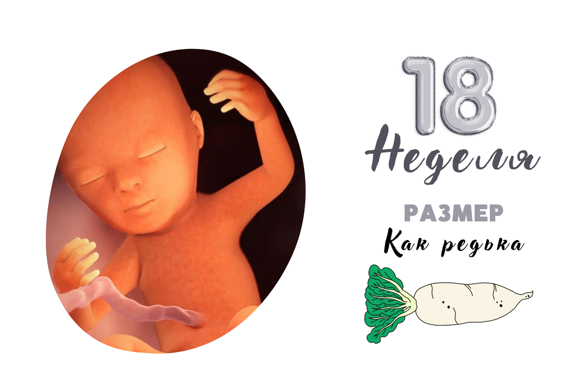 Если вы были удивлены быстрым ростом и набором веса вашего ребенка за последние несколько недель, к 18 неделе это начнет немного выравниваться. На этом этапе малыш может зевать, потягиваться и даже хмуриться. У ребенка развивается чувство вкуса, и теперь вкусовые рецепторы могут различать сладкое и горькое. Ребенок довольно много двигается и может реагировать на громкие звуки из внешнего мира, например, на музыку. Вы можете еще не почувствовать эти движения, особенно если это ваша первая беременность. Начните разговаривать с малышом. Его уши достаточно развиты, чтобы слышать вас! Какой размер вашего ребенка на 18 неделе беременности? Плод теперь составляет примерно 18-20 сантиметров в длину и весит около 115-160 граммов — это размер примерно с редьку! 18 неделя беременности: развитие плода На этом этапе развиваются многие рефлексы ребенка, в том числе слух, глотание и сосание. Малыш становится более активным, он кувыркается и может дергать за пуповину. Сейчас самое время быть более в