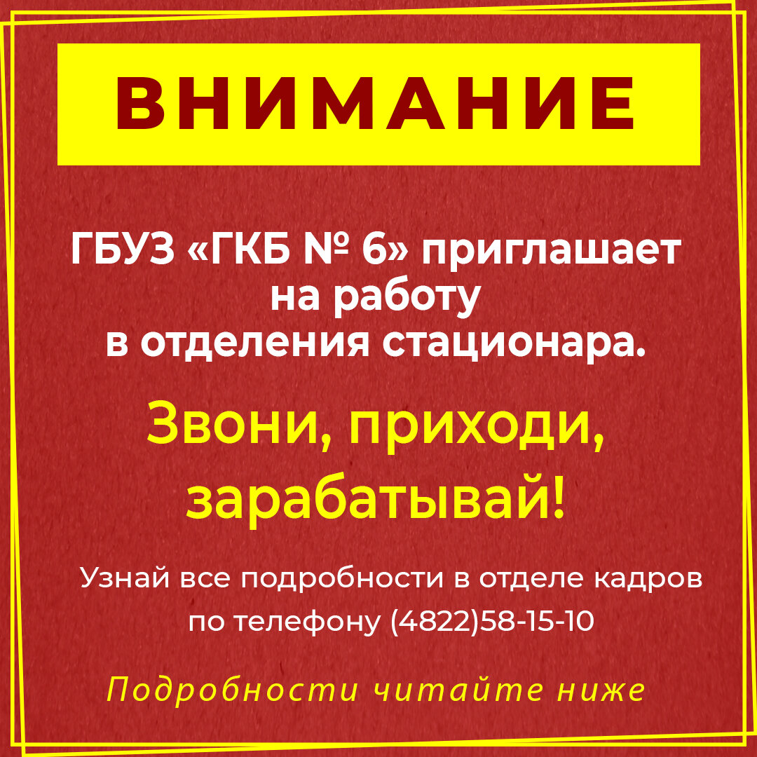 ГБУЗ «ГКБ № 6» приглашает Если ты молодой медик с юношеским максимализмом и амбициями или умудрённый опытом и знаниями медицинский работник. Мы приглашает тебя на работу в легендарную больницу №6, в наш дружный коллектив на должности среднего и младшего медицинского персонала в отделения стационара! Звони, приходи, зарабатывай! Узнай все подробности в отделе кадров ГБУЗ "ГКБ №6" по телефону (4822)58-15-10 ГКБ №6 - Здесь желания реализуются!!!