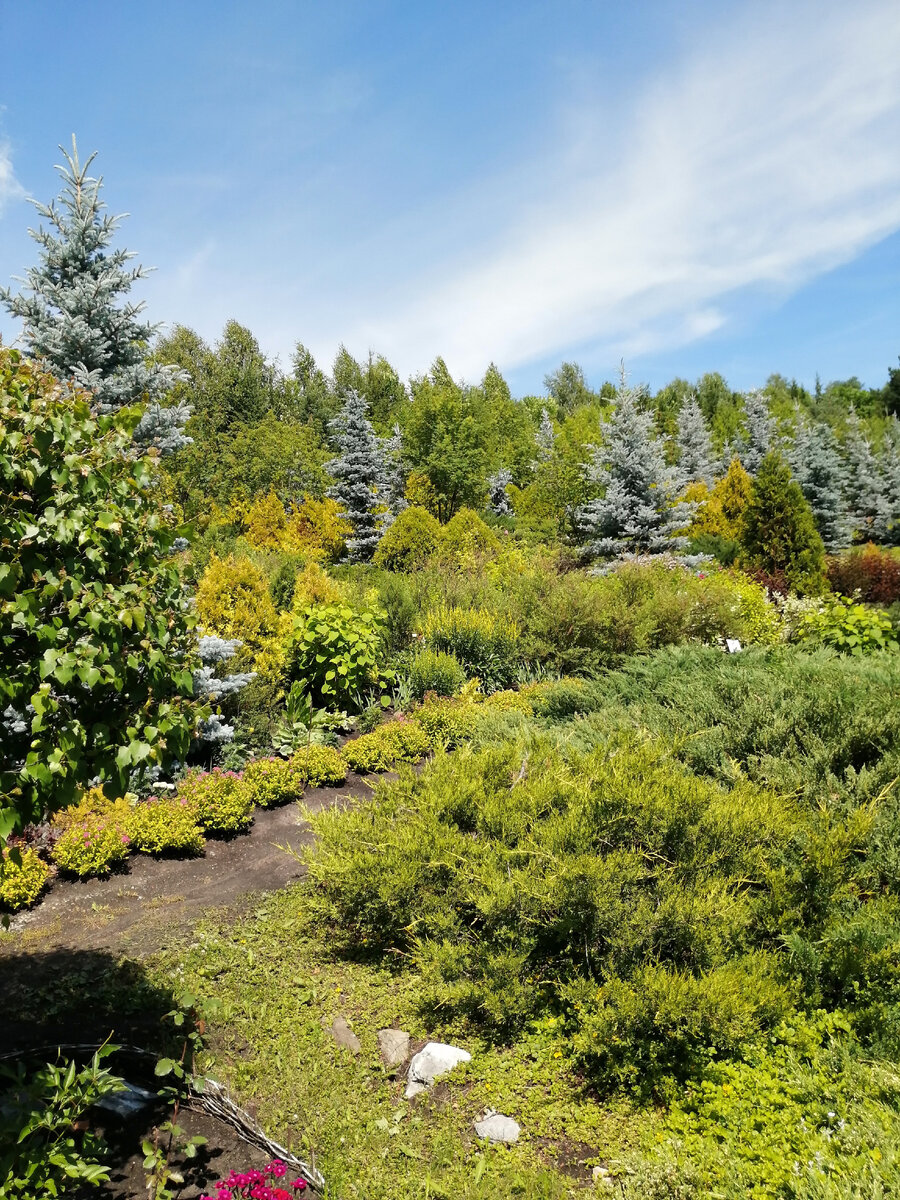 Понятно, что по цвету подбираются растения и в нижней части - там, где дорожки, и основная часть народа. А что дальше и выше? А там интересно. Если один склон, похоже, полностью сделан, то второй в процессе. Выглядит это так - в обычный лесок с обычной растительностью (тут в основном лиственные деревья) подсаживают там голубую ель, там желтую спирею, там темный или оранжевый пузыреплодник. И склон начинает играть красками. Смотрится это очень интересно, даже в таком незавершенном виде. Но мы пока на том склоне, что уже оформлен. Вот тут дорожка пошла вверх - она здесь просто тропинка, никакого бетона. Цветов почти нет, все краски - хвойные и лиственные деревья и кустарники. Ели, спиреи, пузыреплодники, можжевельники и кое-что, что я не смогла определить. Чуть в сторонке и повыше "плантация" герани, к сожалению, уже отцветшей: Оттенки желтого, зеленого, голубовато-сизый - а все вместе смотрится отнюдь не вырвиглазненько: Плюс разнонаправленность линий - вверх, наискосок, параллельно з