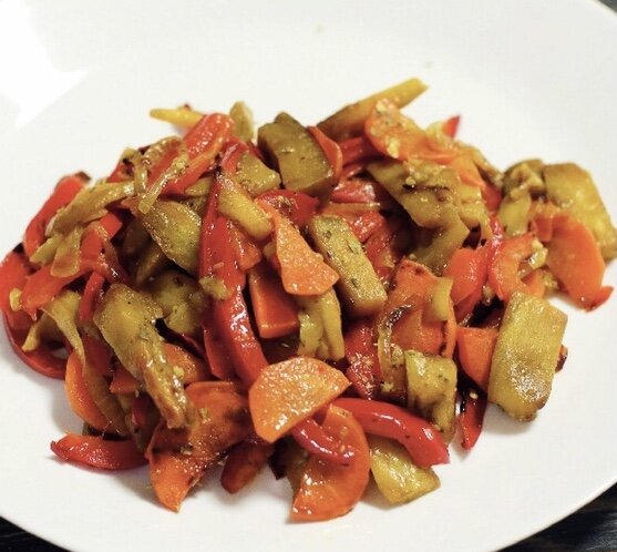 Головная боль любой хозяйки - «что приготовить на гарнир?». Вот прекрасный летний вариант. Готовится за полчаса и подходит к мясу, птице и рыбе. Рагу должно понравится и вегетарианцам 😉 Нам понадобятся: 🍆 2 баклажана; 🍆 3-4 болгарских перца; 🍆 2 моркови; 🍆 большая луковица; 🍆 половина лимона; 🍆 смесь сухих прованских трав; 🍆 немного растительного масла; 🍆 соль и перец по вкусу. Лук и морковь очистим и нарежем. Лук полукольцами, а морковь полукружочками. Обжарим их на сковороде в небольшом количестве масла. Баклажаны очистим. Перцы разрежем вдоль и удалим семена и хвостик. Баклажаны и перцы нарежем соломкой. Добавим в сковороду к луку и морковке. Обжаривать будем 15-20 минут. Из лимона выдавим сок и две столовые ложки сока вольем в сковороду. Туда же добавим чайную ложку сухих трав и натертый на мелкой терке чеснок. Посолим и поперчим по вкусу. Приятного аппетита!!! Если вам понравился рецепт, лайкайте, пишите комментарии, делитесь с друзьями и подписывайтесь на мой канал.
