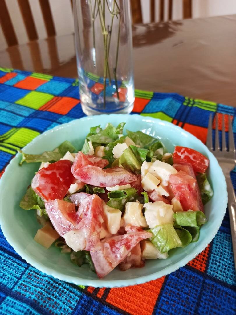 #летнееменю Предлагаю приготовить простой и очень вкусный салат с помидорами, сыром и чесноком. Очень нравится сочетание помидор+сыр 🤩 , чеснок добавит пикантности и остринки, а листья салата - лёгкости . Салат по желанию можно заправить сметаной или йогуртом 🤗. Ингредиенты: помидора, сыр Российский, зелёного салата, чеснока, Перец чёрный молотый, Соль, Майонез Способ приготовления: Приготовить все необходимые ингредиенты. Салатные листья промыть, обсушить. Помидоры нарезаем кусочками. Листья салата порвать руками. Сыр нарезать небольшими кубиками. Салат заправляем майонезом, солим, перчим и аккуратно пepeмeшивaeм. Салат к подаче готов ! Приятного аппетита 😋!!! Если Вам понравился мой рецепт и Вы приготовили по нему-мне будет очень приятно, если оставите свой фотоотзыв 🤗🥰. Интересно посмотреть, что у Вас получилось ❤️💐🤩. Мой видео рецепт можно посмотреть ⬇️