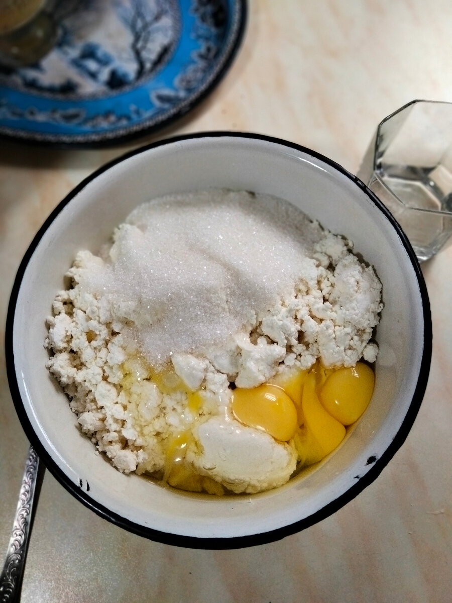 Творога у меня было даже немного больше. Сначала сделала начинку. Творог, яйца, сахар перетерла до однородной массы.