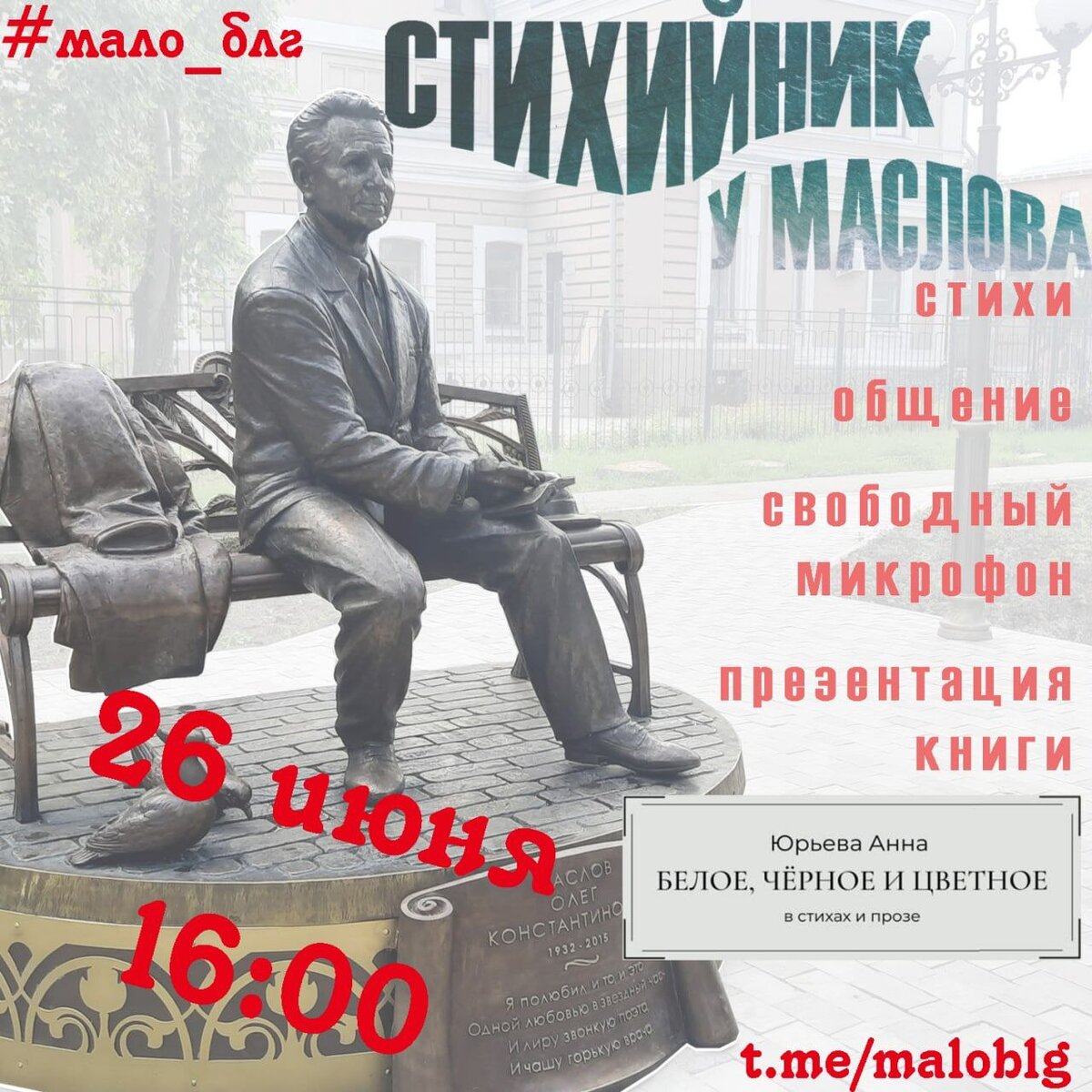Пропасть с радаров #МАЛО_БЛГ, в моём случае, означает провести подряд два писательских челленджа, пересмотреть концепцию своей творческой деятельности и отправить черновик новой книги на конкурс от ЛитРес. . Пришло время рассказать обо всём основательно и подробно. . Начну со «СТИХИйника у Маслова». В это воскресенье, 26 июня, в 16-00 в городе Благовещенске Амурской области в парке культуры у памятника О.К. Маслова состоится презентация книги Анны Юрьевой "Белое, чёрное и цветное в стихах и прозе", а я почитаю свои стихи. . Буду рада вас видеть! До встречи! . #поэтическийвечер #вечер стихов #благовещенскафиша #афишаблг #публичныевыступления