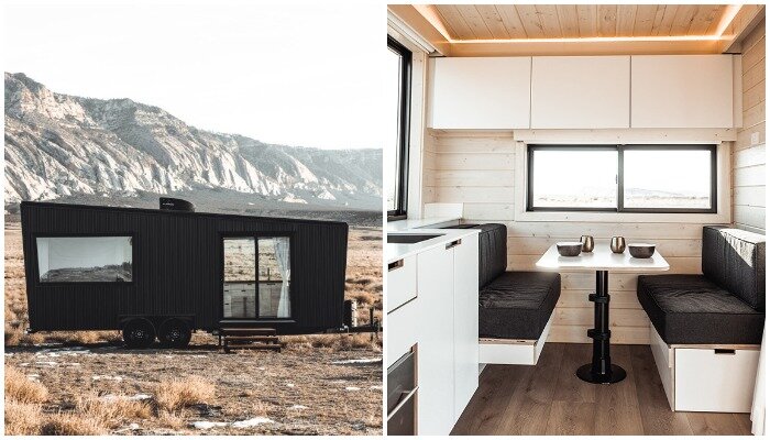 Компания Land Ark RV builder позаботилась о том, чтобы современные кочевники могли путешествовать круглый год и в любой климатической зоне. Фасад домика обшит черным гофрированным металлическим сайдингом, который не продувается, не промокает и не требует дополнительных внедрений или технического обслуживания. Пять больших окон сделаны из двойного закаленного стекла с энергосберегающими функциями. Деревянный каркас дома (пол, стены и крыша) был утеплен как природными материалами, как и дополнительным слоем жесткой изоляции. Крыша выполнена из особо прочного металла, который выдерживает значительную нагрузку от снежного покрова, если путешествующие решат пожить на горнолыжном курорте.