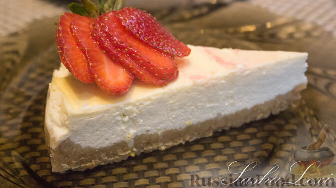 здравствуйте, делюсь с вами классическим рецептом приготовления популярного американского десерта под названием "Чизкейк". Именно так готовят чизкейк в Америке. Получается нереально вкусно! Продукты (на 8 порций) Печенье (любое рассыпчатое) - 300 г Сыр сливочный (рикотта; в идеале - филадельфия) - 500 г Сливки 35% - 200 г Яйца куриные - 4 шт. Масло сливочное - 100 г Сахар - 5 ст. л. Лимон (для цедры) - 0,5-1 шт. Ванилин - 1 пакетик (по вкусу) Для украшения (по желанию): Сахарная пудра Ягоды свежие (в рецепте клубника,но вы можете взять любые) Измельчите печенье до состояния крошки. Сливочное масло растопите на водяной бане. Перемешайте печенье с 1 ст. ложкой сахара, добавьте масло, тщательно перемешайте. Форму для запекания (диаметр моей формы - 22 см) застелите пергаментной бумагой. Из полученной массы сделайте основу для чизкейка в форме для запекания и поместите ее в духовку, разогретую до 170 градусов, на 10 минут. Пока корж находится в духовке, займитесь приготовлением сырной н