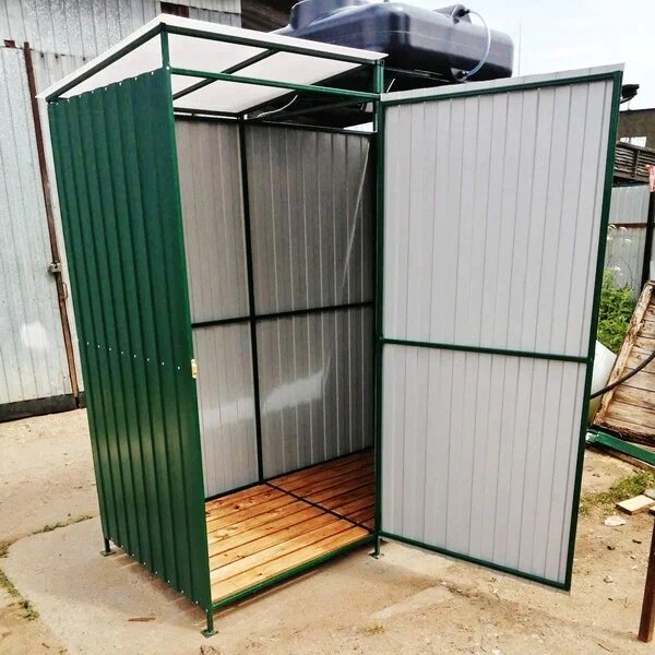 Мы рады представить Вам новые душевые кабины в нашем ассортименте. Это уникальные многофункциональные конструкции, которые подарят принципиально новый уровень комфорта на любых локациях: стройках, пляжах, садовых участках. В первую очередь хотим познакомить Вас с душевой кабиной из профильного листа с рядом особенностей. Во-первых, это объемный верхний резервуар для воды в 200 литров. Это позволит не тратить время и силы на заполнение бака снова и снова слишком часто. Такого объёма хватает на большое количество пользователей. Он подходит для комфортной и относительно интенсивной эксплуатации в местах с высокой проходимостью. Такой душ, например, отлично подходит для строительных и производственных площадок. В комплектацию данной модели душевой кабины также входит водонагреватель. Вам достаточно подключить конструкцию к электричеству и качественный ТЭН будет быстро и эффективно нагревать воду, и все пользователи всегда будут иметь возможность принять тёплый бодрящий душ. Преимущество за