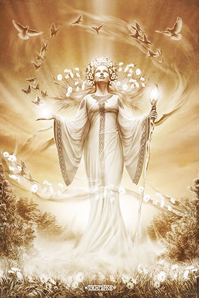Лада Матушка — богиня любви, красоты, процветания, благополучия и плодородия, покровительница семейных союзов, поддерживающая лад и мир в доме. Она — животворящая сила, являет собой образ Богини-Матери, дарующей жизнь и поддерживающей существование мира на протяжении всего цикла существования. Она сохраняет в гармонии и равновесии всё мироздание с начала времён. Всё существующее в мире находится под её покровительством. Лада суть причина всего сущего — движущая сила Вселенной, которая проявляет энергию из Нави в Явь. Богиня Лада — прекрасная хозяйка Ирия Светлого, гармонию и лад дарует она людям, силой Любви своей беЗмерной оберегает она наш мир от бед и зла.