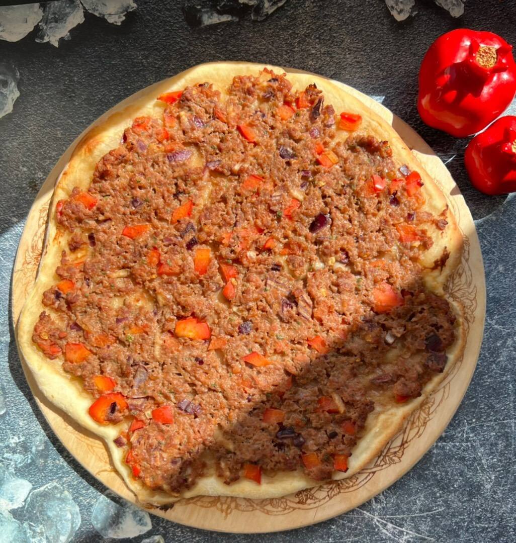 «Лам» в переводе с арабского означает мясо, «джун» — хлеб. Это тонкая лепешка с начинкой из мяса и овощей. Сыра в ней нет( кстати, одну лепёшку я делала по оригинальному рецепту, другую- с моцареллой- так этот вариант в семье больше зашёл 🙃.) Идеальный ее размер около 20 см и вес до 200 гр. Ингредиенты: Тесто, Вода, Мука , соли, оливкового масла, Начинка, говяжьего фарша, луковица, болгарского перца, помидор, чеснока, зелени, Соль/перец Способ приготовления: Для теста все ингредиенты смешать и тщательно вымесить. Завернуть в плёнку и дать постоять минут 30. Тем временем готовим начинку. Лук, перец, зелень и чеснок мелко рубим. Помидор разрезаем на четыре части и измельчаем на тёрке- в итоге у нас в руках остаётся только шкурка- ее выкидываем. Посыпаем специями и перемешиваем. Если вам кажется, что начинка недостаточно сочная- можно добавить пару ложек воды- начинка должна хорошо размазываться по лепешке. Тесто делим и раскатываем тонкие лепёшки. Около 40 -60 грамм начинки- у меня это