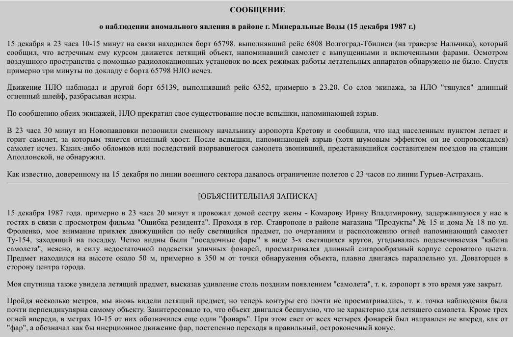 Сообщение о наблюдении аномальных явлений в районе г. Минеральные воды от 15 декабря 1987 года