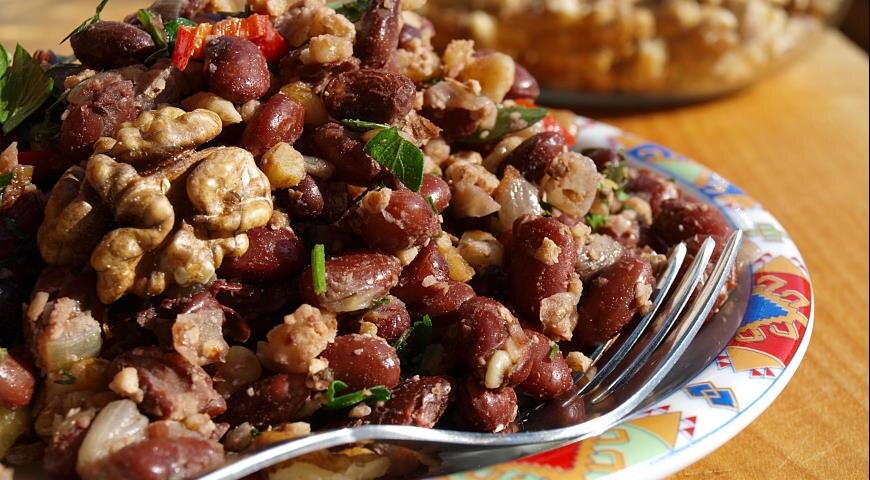 Отварить красную фасоль до мягкости. Пропустить через мясорубку. Мелко нашинковать репчатый лук. Истолочь ядро грецкого ореха, разбавить его 2-3 ст. ложками фасолевого отвара. Смешать фасоль, лук и орехи. Заправить солью и перцем, выложить на блюдо. Посыпать измельченной зеленью салата и петрушки. На 100 г фасоли – 25 г очищенного ядра грецкого ореха, 1 головка лука, соль, перец по вкусу.