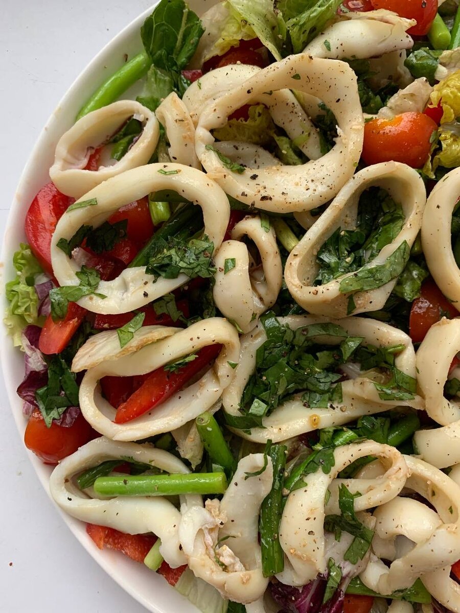 Вот как раз и пригодится все, что привезли с дачи - и чесночные стрелки, и мята, и редиска, и молодая капуста! А если дачи нет, то самое время покупать овощи на рынке - и вкусно, и недорого, а польза какая! Тёплый салат с кальмарами Я беру упаковку «Командорских», их не надо чистить, только убрать лишнее. 1/2 упаковки нарезать кольцами и отварить 5 мин. Быстро обжарить горсть чесночных стрелок. Выложить салатную смесь или шпинат/руккола, добавить нарезанные пополам помидоры черри (стандартная пачка), 1 красный сладкий перец нарезанный тонкими полосками, тёплые стрелки и кальмары. Для заправки смешать 4 ст л олив масла, 2 ст л соевого соуса и мелко нарезанную кинзу. Салат с адыгейским сыром Тонко нашинкуйте половину небольшого кочана молодой капусты. Сбрызните соком лимона, чуть посолите, слегка помните руками. У пучка укропа обрежьте стебли, отправьте в чашу блендера вместе с 2 зубчиками молодого чеснока. Посолите и, подливая ароматного подсолнечного масла, измельчите. Смешайте с к