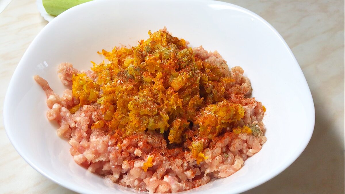 Приготовление начинаю с фарша. Лук и морковь обжариваю на растительном масле. Лук готовлю до прозрачности и добавляю морковь натертую на мелкой тёрке. Готовлю все до лёгкого золотистого цвета. Фарш у меня сегодня из свинины. Добавляю к фаршу подготовленный лук с морковью, натираю один маленький зубчик чеснока, добавляю соль (учитываяю что кабачки возьмут часть соли на себя), чёрный молотый перец, сладкую копчёную паприку и все перемешиваю. Фарш не отбиваю, просто тщательно перемешиваю. Для этого блюда кабачки выбираю небольшие и одинаково размера. Мою, разрезаю на две одинаковые части и при помощи чайной ложки убираю серединку. Получаются своего рода лодочки. Остатки от кабачков я не выбрасываю. Готовлю из них оладьи. Выкладываю кабачки на противень. Из фарша делаю фрикадельки и выкладываю в лодочки. Фрикадельки делаю не очень маленькие, так как во время запекания они уменьшаться в размере. Между фрикадельками выкладываю маленькие кусочки сыра, у меня моцарелла. Отправляю противен