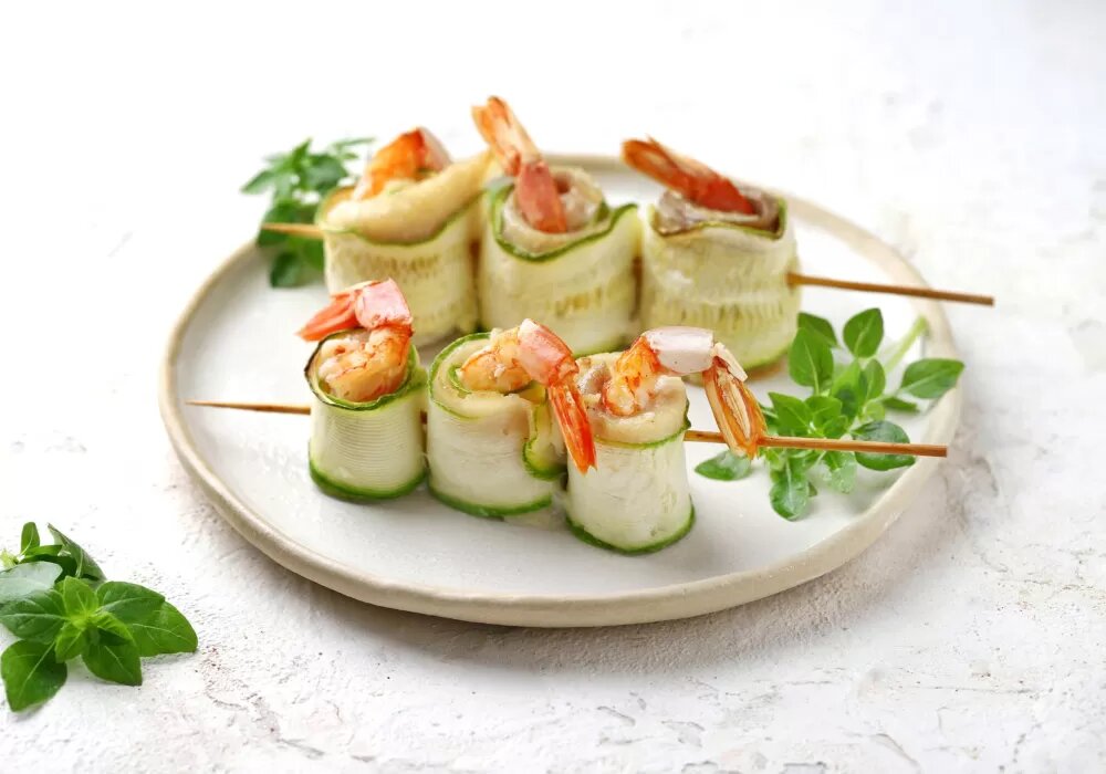 Красивая и вкусная закуска из кабачка с рыбой и креветкой украсит любой праздничный стол. Она станет хорошим дополнением к салату из свежих овощей. Такие рулетики готовятся очень просто, запекаются в духовке и получаются легкими и полезными. Как приготовить рулетики из кабачка с рыбой и креветками Ингредиенты:
