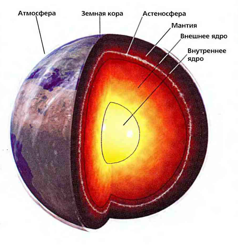 От поверхности Земли до ее центра приблизительно 6380 км. Это расстояние в 600 с лишним раз больше, чем глубина самой глубокой океанской впадины, высота самой высокой горы или толщина тропосферы. Получается, что та часть нашей планеты, с которой мы непосредственно соприкасаемся, ничтожно мала по сравнению с ее недоступными нам недрами . Человеческое любопытство, однако, невозможно ограничить рамками доступного. Исследуя внешние слои земной тверди, сотрясая Землю направленными взрывами и делая выводы на основе открытых законов природы, люди составили представление о внутреннем «устройстве» Земли. Предполагается, что при приближении к ее центру возрастают температура (она составляет в центре 5000- 6000 °С, как на поверхности Солнца), плотность вещества и давление внешних слоев. При столь высокой температуре все известные вещества должны были бы расплавиться . Но плавлению препятствует невероятно высокое давление. Поэтому вероятно, что Земля в разрезе имеет следующую структуру. Сверху н