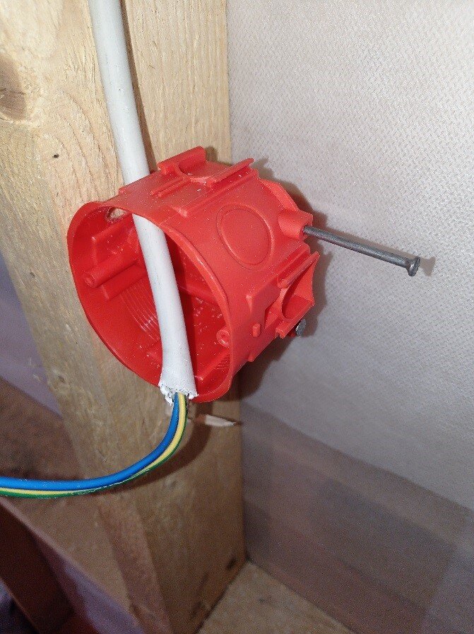 Всем доброго дня. Хочу поделиться опытом прокладки электропроводки в каркасном доме. Проанализировав информацию в интернете, кто как делает для себя сделал выбор на опыте финских электриков. Они используют коробки для монтажа в которых есть отверстия для гвоздей, и тем самым их удобно крепить прямо к стойке каркасника без дополнительных «надставок». Я пробовал и другие варианты, но ввиду того что у каркасного дома нет стены, а коробку только можно прикрутить через дно к стене, то это самый быстрый и удобный вариант крепления. Прокладку провода я решил также по аналогии, как делают финны. По их логике провод находится в трех изоляциях: сама жила в изоляции, потом общая низкогорючая изоляция и общая для защиты от механических повреждений. И не надо использовать никаких гофр, тем более сама гофра из горючего материала (я так и не понял зачем её применять). Не помню у кого, но еще подсмотрел вот такую хитрость, в местах прохода провода на стойку прикрепить пластину, чтобы случайно не пр