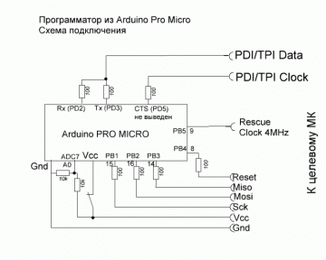 В статье описывается создание из модуля Arduino Pro Micro 5 В / 16 МГц, приобретенного на AliExpress и дополнительной платы с элементами (шилд) к ней внутрисхемного программатора AVRISP-MKII, предназначенного для внутрисхемного программирования микроконтроллеров компании Atmel. В 2016 году компания Atmel была поглощена одним из своих конкурентов — компанией Microchip Technology, которая продолжает выпускать часть продукции компании Atmel. Модуль совместимый с Arduino Pro Micro 5В/16МГц (на 3,3В/8МГц не подойдет) приобретался на AliExpress. От себя добавлю, что данный программатор работает с протоколами: ISP – для основной массы микроконтроллеров Atmel; PDI - для ATXmega; TPI – для мелких ATtiny, например ATtiny10 . Особенности моего варианта исполнения программатора: напряжение питания внешнего программируемого микроконтроллера +5 В; наличие защитных резисторов величиной 100 Ом для долгой и счастливой жизни модуля Arduino Pro Micro; возможность измерения напряжения питания программиру