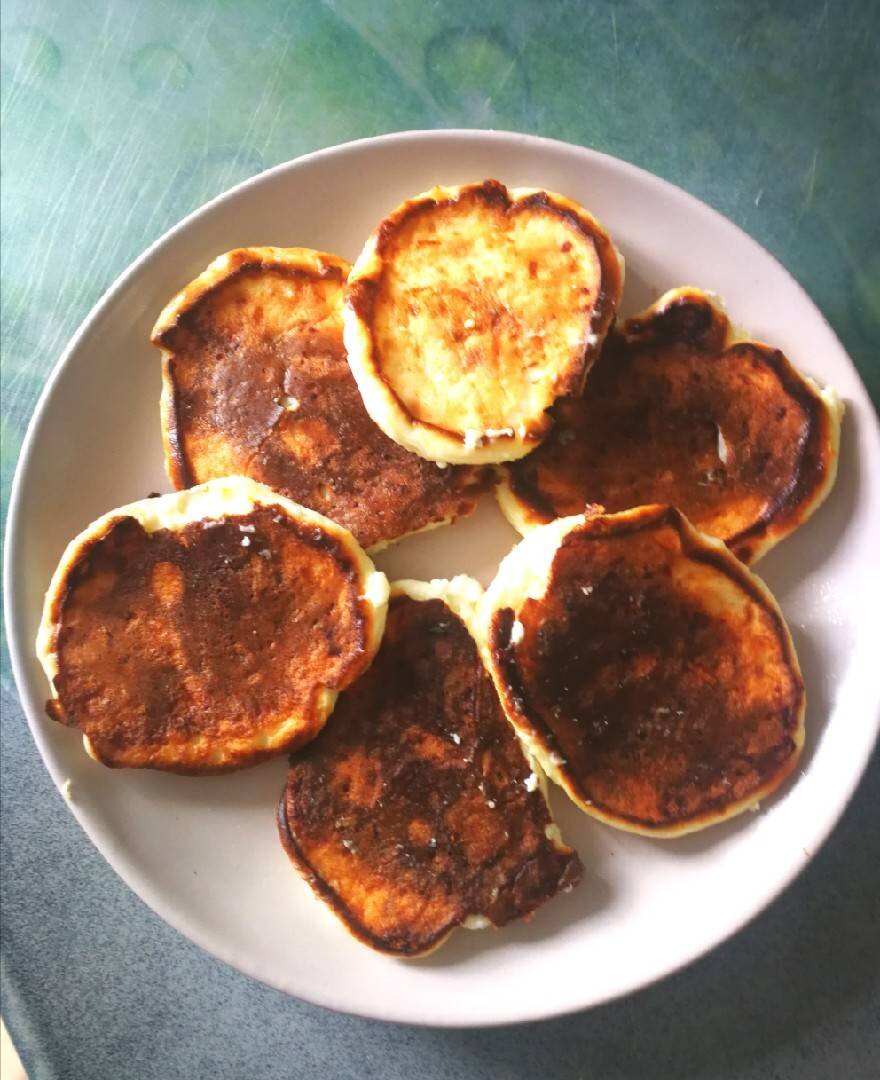 #пп Вкусные, лёгкие, быстроготовящиеся)) Рецепт рассчитан на 1 взрослую порцию завтрака. Ингредиенты: - мягкого творожка (у меня Данон), - яйцо куриное СО или С1, - мука рисовая ц/з, - сыр лёгкий твёрдый (у меня Тысяча озер 15%) Способ приготовления: Сыр натереть на мелкой или средней тёрке. Смешать с творогом, яйцом и мукой. Всё тщательно перемешать. Ложкой выложить на разогретую антипригарную сковороду. И выпекать обязательно под крышкой (иначе не схватятся) на среднесильном огне. Не забудьте перевернуть на другую сторону, после того, как зарумянятся. А то получатся сильно зажареные, как у меня )))) в этот раз. Можно полить соусом при подаче, можно есть так. У меня клубнично -кокосовый соус нынче)) Соус: клубнику и кокосовое молоко смешать в блендере. Приятного аппетита, мои дорррогие!