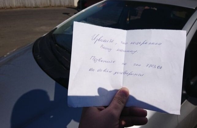 Выйти с утра к автомобилю и увидеть повреждения ситуация не из приятных, но если виновник ДТП решил оставить записку с номером телефона, значит все не так плохо. Гораздо хуже было бы если бы виновник повредил автомобиль и просто уехал. Поэтому паниковать не стоит, нужно сразу позвонить по указанному в записке номеру и договориться с виновником о способах возмещения ущерба.