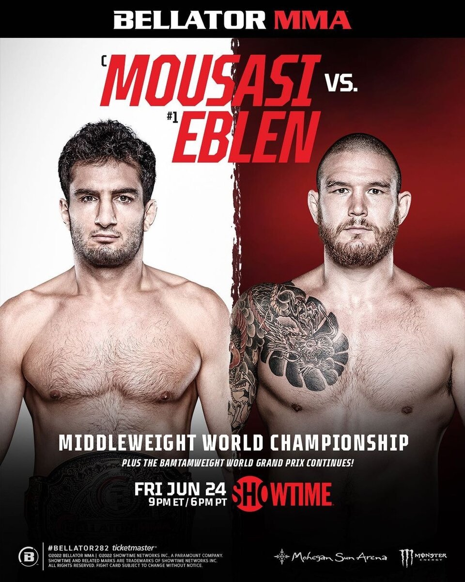 25 июня в США пройдет турнир Bellator 282, в главном бою вечера Гегард Мусаси будет защищать титул чемпиона Bellator в среднем весе, а его соперником станет непобежденный Джонни Эблин. Что будет интересного Разумеется, что всех интересует главный поединок турнира. Легендарный Гегард Мусаси в очередной раз защищает титул в среднем весе, а противостоять ему будет непобежденный проспект Джонни Эблин. Россиянин Магомед Магомедов будет драться в четвертьфинальном поединки гран-при легчайшего веса с Энрике Барзолой. В рамках Bellator 282 россиянин Александр Шаблий подерется с Брентом Примусом, а Анатолий Токов сразится с Мухаммадом Абдуллахом. Как смотреть турнир в обход блокировки Bellator 282 пройдет в США в ночь с 24 на 25 июня, начало прямой трансляции в 01.00 по московскому времени. Состав участников Bellator 282 Основной кард Гегард Мусаси — Джонни Эблен Магомед Магомедов — Энрике Барзола Леандро Хиго — Дэнни Сабателло Брент Примус — Александр Шаблий Кэт Зингано — Пэм Соренсон Предвар