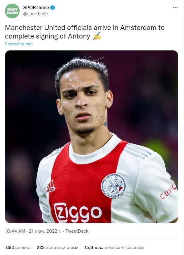 Официальные лица «Манчестер Юнайтед» прибыли в Амстердам, чтобы завершить подписание Антони