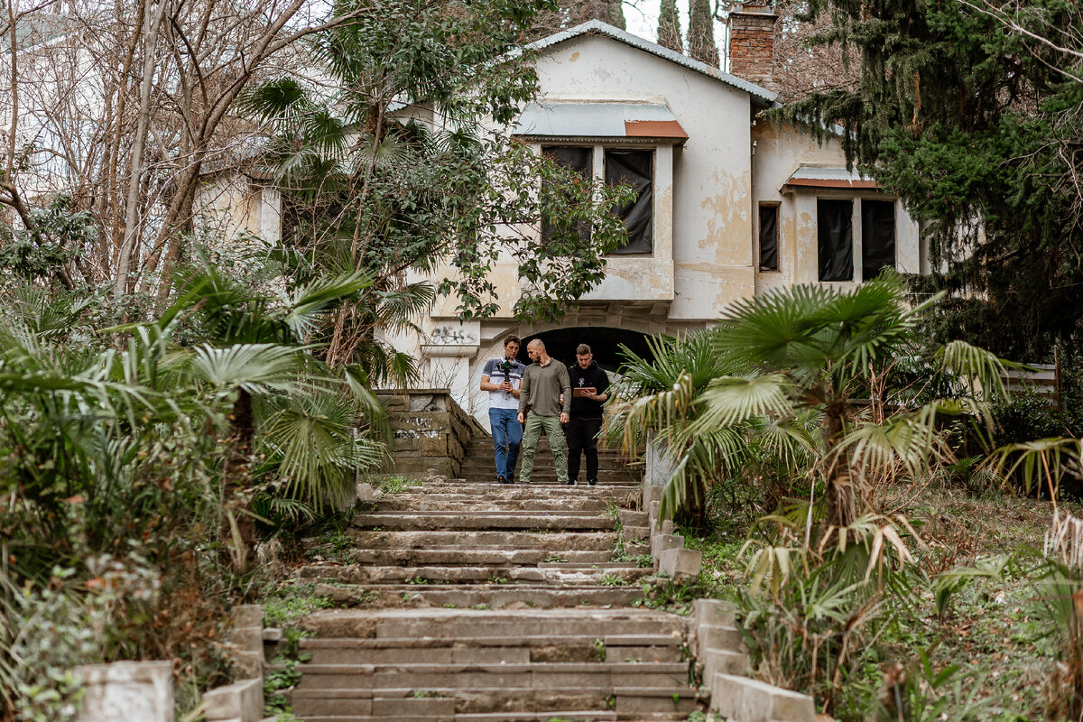 Вместе с заказчиком оперативно искали новую локацию. Обзванивали, объезжали, обсуждали... Из нескольких вариантов выбрали дачу полковника жандармерии Квитко в районе Сочи, напоминающую средневековую крепость в миниатюре. Идеально для поиска сокровищ! Свою роль сыграло и легкое получение разрешения на съемку в открытом для туристов месте.