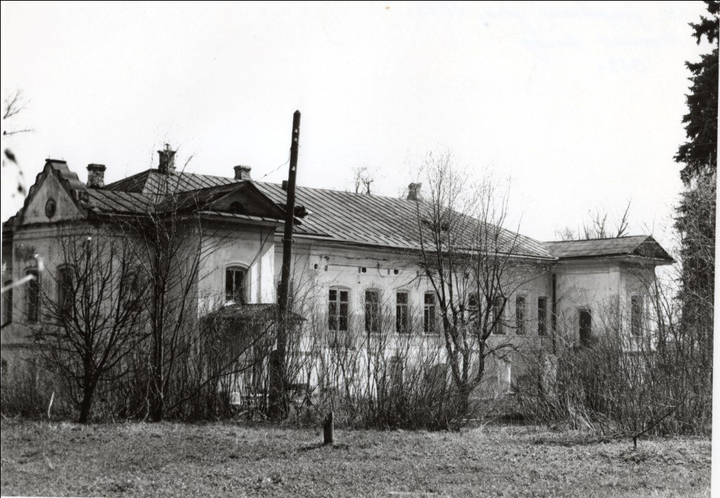 Дата постройки главного дома нам не известна. Но в результате обследования в его архитектуре были прослежены элементы русского барокко, скрытые поздними перестройками. И хотя материалы Генерального межевания говорят нам о том, что в 1770-х годах в усадьбе «церковь во имя Владимирския Пресвятыя Богородицы и господский дом деревянные», постройку главного дома в камне можно отнести к 30-40 гг. XVIII века. Во-первых, документально известно, что храм Владимирской Богородицы был возведен в 1744 году. Уже этот факт вступает в противоречие с данными Генерального межевания. Во-вторых, размеры кирпича использованного при строительстве главного дома соответствуют размерам кирпича, из которого была сложена Владимирская церковь. В-третьих, объемно-планировочной структуре дома, элементы утраченного барочного архитектурного убранства его фасадов обнаруженные под штукатуркой, свидетельствуют о более раннем, чем принято считать, происхождении. Надо полагать, что главный дом в камне строился приблизительно в те же годы что и Владимирская церковь, в рамках единой концепции развития комплекса. Это был приземистый двухэтажный объем с двумя небольшими фланговыми ризалитами по южному фасаду. Три арочных проема первого этажа… Над оконными проемами навершия лучковые и треугольные. Со стороны дворового фасада терраса на кирпичных столбах.