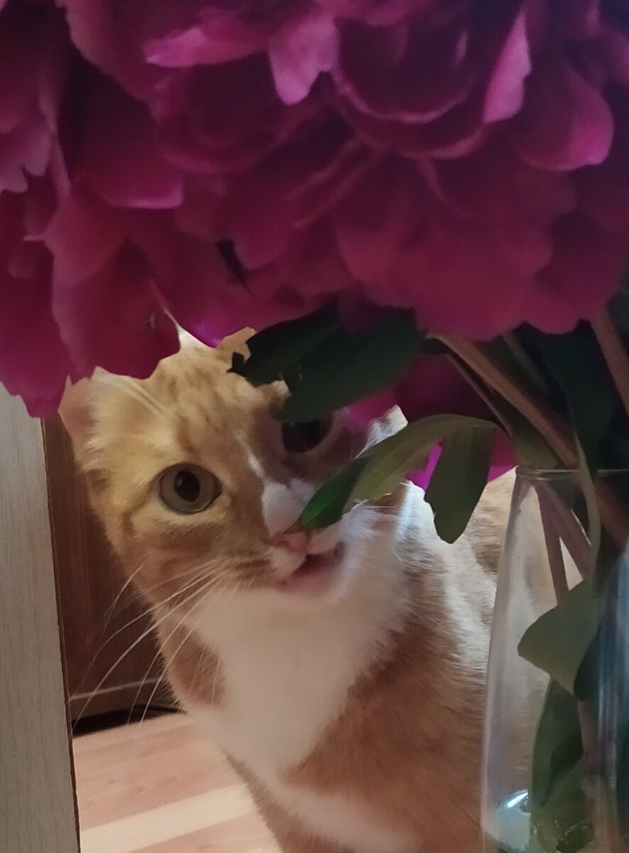 Всём привет! С вами Алёна и Алиса. В последнее время приносят много цветов. Особенно кошка любит пионы. И даже ест их. Гвоздики тоже не обделила вниманием. Вот что-то ещё принесли. Летняя композиция-ромашки и ирисы. Оценила. Роза-королева цветов. Она тоже была в нашем доме. Алиса же девочка, любит цветы.