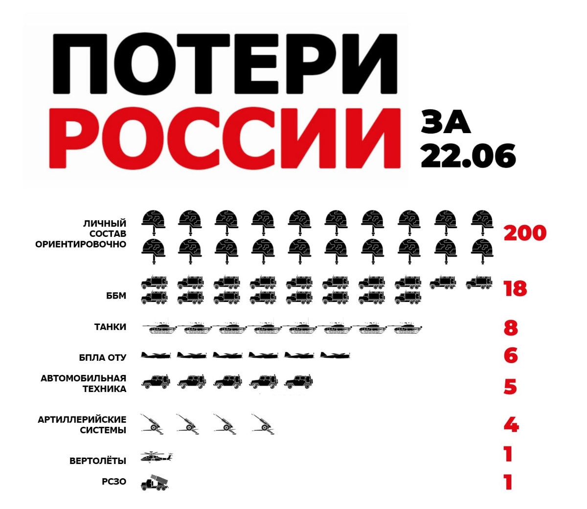 Только за 22 июня потери личного состава вс рф, составило более 200 человек убитыми. Было утеряно 6 единиц автотехники, 18 ед. боевых бронированных машин, 8 танков, 6 беспилотников оперативно-тактического уровня, 3 артиллерийских систем, одна система РСЗО, один вертолёт. Печаль)