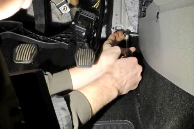 Первым бастионом на пути к замене салонного фильтра станут три болта, которые крепят педаль газа. Один находится слева внизу, и к нему проще подобраться. Два других расположены сверху. Для работы подойдет торцевая головка на 10 или трещотка с карданом, гибким валом. Не нужно прилагать серьезных усилий. Крепежные элементы легко поддаются, ведь в салоне низкая влажность, поэтому не развивается коррозия.
