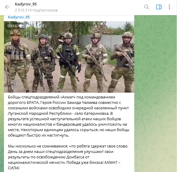 Рамзан Кадыров у себя в Telegram-канале анонсировал окружение Лисичанска. У нас есть хорошие результаты и в направлении Северодонецка и Лисичанска, откуда мой дорогой брат Апты Алаудинов также передает оперативную информацию об успехах работы наших войск и войск ЛНР. В самое ближайшее время вы услышите сообщение о взятии Лисичанска в кольцо и зачистки его территории от бандеровских оккупантов», — рассказал Кадыров днём 22 июня. Спустя несколько часов аналогичное заявление сделал подполковник Народной милиции ЛНР Андрей Марочко. Вечером 22 июня он отметил, что в ближайшее время группировка украинских войск в районе Лисичанска и Северодонецка будет в окружении. А уже 23 июня Кадыров рассказал о другом окружении. «По имеющейся достоверной информации, противник взят в плотное кольцо между населенными пунктами Золотое и Горское, тем самым, закрыты все пути отступления. Положение укронацистов весьма плачевное и чревато серьёзными последствиями в виде скорого сокрушительного поражения», — соо