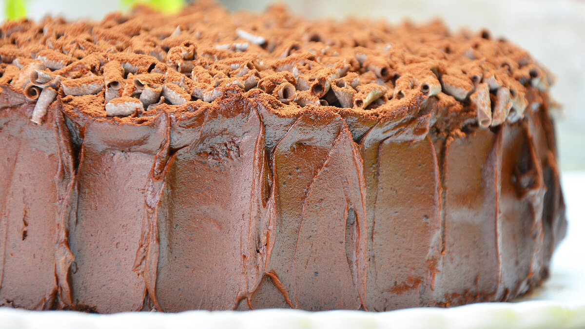 Поверхность торта можно посыпать шоколадной стружкой и какао порошком, чтобы придать ему законченный вид и сделать его ещё более шоколадным.