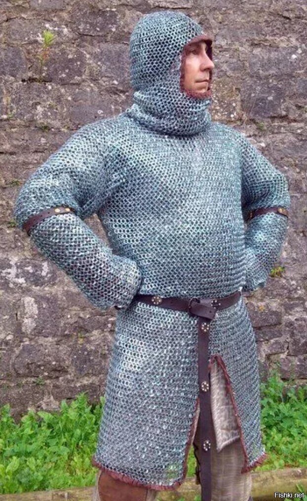 Основным броником для мало-мало состоятельных воинов на долгие века стала кольчуга — однако с античных времён она непрерывно развивалась. Удлинялись рукава (до локтя, а то и до запястья), полы (до колена). Добавился прикрывающий голову капюшон, который носили как дополнительную защиту под основным шлемом. В качестве дополнительного элемента появились кольчужные чулки, полностью защищающие ноги воина. Кольчужный доспех, полностью закрывающий воина выше колен (10 век), получил название «хауберк» и выглядел примерно так: