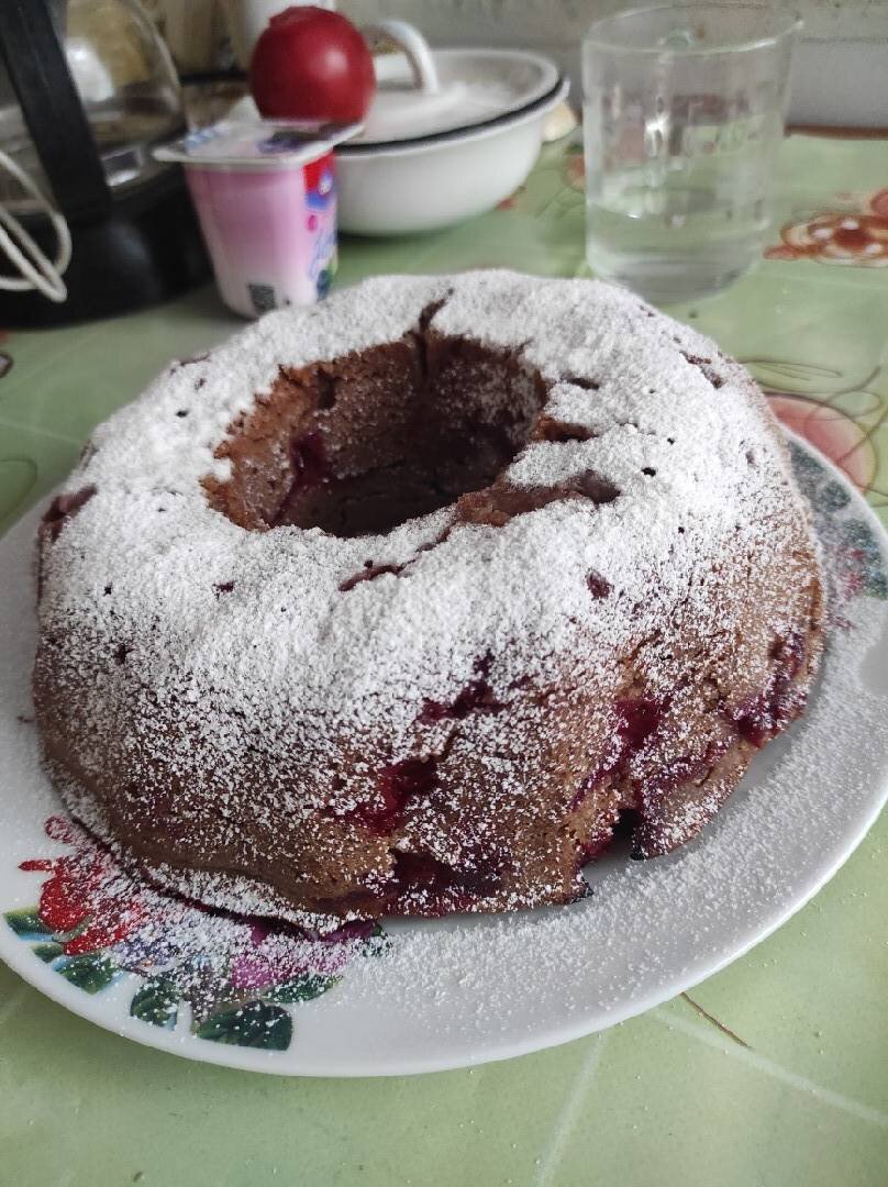 Ингредиенты: муки пшеничной, кефира или кислого молока, разрыхлитель, подсолнечное масло или 50 г сливочного, сахара , какао порошка, яйцо, вишни, ванилина Способ приготовления: Яйцо взбить миксером с сахаром. Добавить кефир, перемешать. Добавить муку смешанную с разрыхлителем, какао и ванилином. Все хорошо перемешать. Вишню очистить от косточек и посыпать мукой или крахмалом. Всыпать в тесто и перемешать. Форму смазать маслом и выложить тесто, печь при 170-180 градусах 35-40 минут.