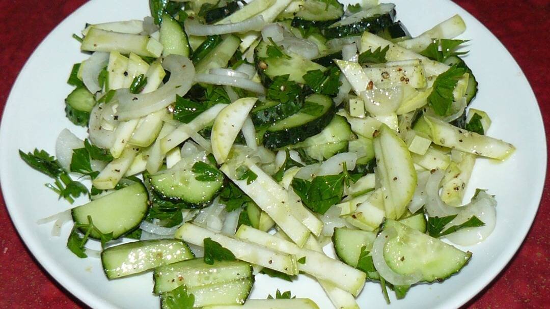 Этот вкусный и полезный салатик можно приготовить за 5 минут. Ингредиенты: - кабачок, - огурцы, - зеленый лук, - петрушка, - бальзамический уксус (по желанию), - растительное масло, - соль, специи Способ приготовления: Огурцы порезать тоненькими полукольцами, кабачок - тоненькой соломкой. Зеленый лук и петрушку порезать мелко. Все сложить в тарелку, салат посолить по вкусу, поперчить и заправить оливковым или другим растительным маслом. По желанию можно добавить бальзамический уксус. Он придаст немного остроты салату. Хорошо перемешать. Более подробно и наглядно - смотрите видео: