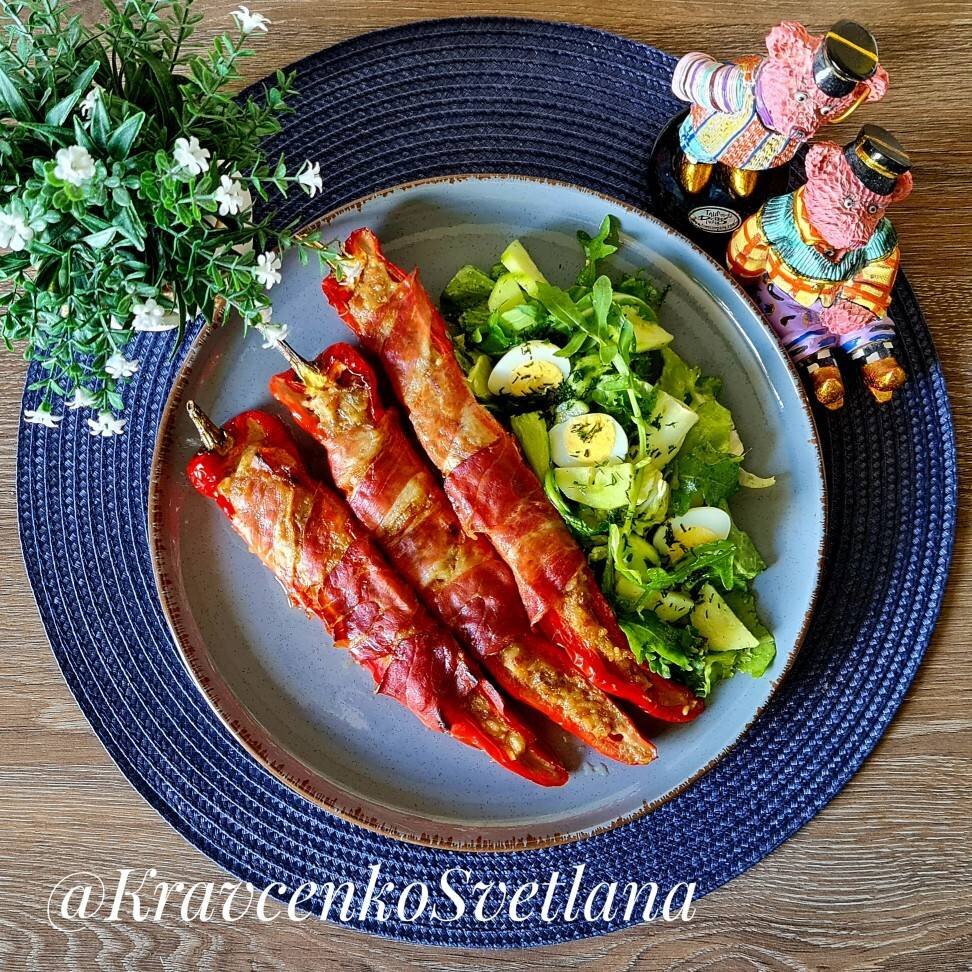 #летнееменю Фаршированный перец - это одновременно и мясо, и овощи. В такой привлекательной подаче это блюдо точно украсит любой стол. Ингредиенты: остроконечных перца, фарш мясной, яйца, рис, лук, по вкусу соль, перец, специи, сыровяленая ветчина, растительное масло Способ приготовления: Рис предварительно отвариваем. Смешиваем фарш, рис, лук, яйца. Добавляем соль, специи, хорошо вымешиваем. Перцы разрезаем пополам, удаляем семена. Фаршируем подготовленным фаршем. Каждый перец оборачиваем ветчиной. Укладываем в форму (форму смазать растительным маслом) и запекаем 45 мин - при180 С. Приятного аппетита!