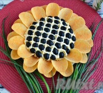 Существует немало вариантов приготовления салата в виде цветка подсолнуха. Я предлагаю вам рецепт очень вкусного салата "Подсолнух" с курицей, грибами и чипсами. Такой салатик приготовить несложно, украсить тоже, главное - аккуратность! Этот красивый и яркий салат станет украшением любого праздничного стола, ваши гости его оценят по Ингредиенты Для приготовления салата "Подсолнух" с курицей, грибами и чипсами понадобится: шампиньоны свежие - 150 г; растительное масло - 2 ст. л.; лук - 0,5-1 шт.; соль, перец черный свежемолотый - по вкусу; куриное отварное мясо - 200 г; яйцо вареное - 2 шт.; шампиньоны маринованные - 100 г; сыр твердый - 80 г; черные оливки без косточек - 0,5 банки; майонез - по вкусу; чипсы картофельные типа "Pringles" - 0,5 банки. !