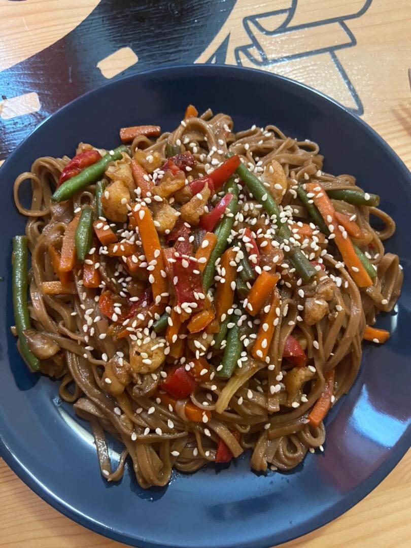 Для всех любителей азиатской еды рекомендую попробовать элементарный рецепт гречневой лапши ( соба) и овощей! Ингредиенты: Гречневая лапша , Овощная китайская смесь (замороженная), Имбирь, Соевый соус, Кунжут (для украшения) Способ приготовления: На раскаленную сковороду кидаем овощи, параллельно ставим воду для лапши. Обратите внимание, что соба варится около 3-4 минут, а после обязательно скидывается на дуршлаг и промывается холодной водой. Овощи по мере зримого приготовления, заливаются соевым соусом, натертым имбирем. Перемешивая, тушим около 5 минут. Когда лапша готова, добавляем ее к овощам. Перемешиваем. Томим минуту и раскладываем по тарелкам. Посыпаем кунжутом для подачи. Блюдо готово. Приятного аппетита!