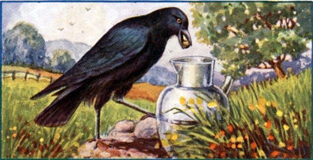 Эзоп (Басня) (Ромул, IV, 13) Ворона, которой хотелось пить, подошла к кувшину, до половины налитому водою, и попробовала его наклонить. Но кувшин стоял крепко, и она не могла его сдвинуть. Увидев это, ворона выдумала такую уловку. Подбирая камешки, она стала бросать их в воду, и от множества камешков вода в кувшине поднялась. Так ворона и утолила свою жажду. Так бывает с дурными людьми, которые не хотят поделиться своим добром с друзьями. Источник: http://ezop.su/fedr_vorona_i_kyvshin/ Олег Слюсарев (Стихотворение) Было жарко. Солнце грело. Ворона пить очень хотела. А вокруг ни лужицы, ни ручейка. Духота, ни ветерка. Видит ворона кувшин. Вдруг в нем вода - - подумала она - напьюсь я тогда. Ворона в горлышко глянь: Обрадовалась. Ура!! Попыталась ворона кувшин наклонить. Толкала, толкала...не удается водички испить. С досады бросила внутрь кувшина камушек. Внутри булькнуло. Ворону ещё больше раззадорило. Стала ворона камушки бросать туда и поняла, что приближается вода. Камни воду вытесн