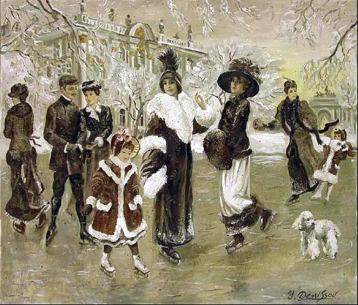 Ледяной каток. Не меньшей популярностью в усадьбах пользовались ледяные катки, которые заливали на площадках, летом используемых для игры в городки, крокет, лаун-теннис, обустраивали на усадебных прудах, расчищая территорию для катания на коньках, специальных коньковых санках, для целого ряда активных игр таких как: «Променад» (для взрослых), «Петушки», «Разиня» (для детей). Во время приема гостей, каток украшали разноцветными фонариками, флажками, обрамляли хвойными ветками увитыми пестрыми лентами. Любопытный каток был устроен в усадьбе Кудрявцево Владимирской губернии Самсоновыми для большого приема гостей. Было подготовлено несколько ледяных площадок соединенных между собой ледяными дорожками. На каждой площадке устроены были различные угощения и сюрпризы. Всем гостям предлагалось передвигаться по усадьбе на коньках. Лишь пожилым гостям и тем, кто был «слаб в ледном ходу» предлагались кресла-сани возимые лакеями.