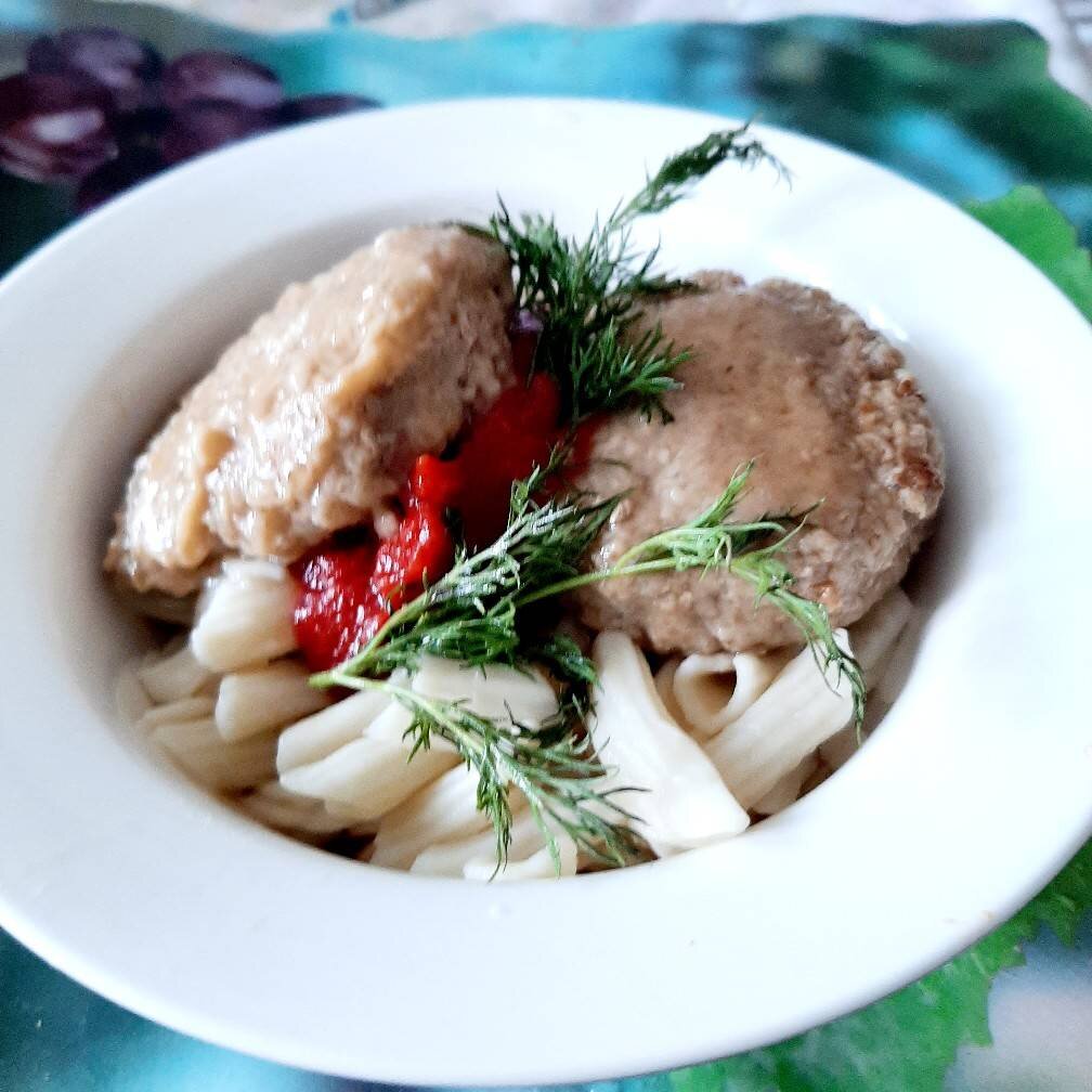 #летнееменю Такие биточки или котлеты я еще не ела!!!! Ингредиенты: Мука для обвалки, Кипяток для припуска, Кубик бульона куриный, Масло растительное для жарки, Фарш для котлет, Фарш свиной свой, Сухари перемолотые , Тыквенное пюре, Соль , Чеснок , Кубик бульона, Лук Способ приготовления: Почистить чеснок, лук, промыть. Отмерить фарш, пюре. Положить в чашу блендера лук, чеснок, сухари, вылить пюре. Перемешать. Вылить эту смесь в готовый фарш и тщательно перемешать до однородности. Посолить, добавить бульон сухой, перемешать. Биточки формировать, прихлопывая, как бы выбивая воздух, с руки на руку. На вес по 60 - 70 г. Обвалять в муке, выложить на сковороду с маслом. Жарить на масле с двух сторон по 7-10 мин с каждой стороны до корочки. Обжаренные биточки пассеруем кипятком, бросив туда еще кубик бульона минут 5-7 Вот и все. Доча свинину не ест, но эти биточки прям умяла и попросила еще. Этот фарш пойдет для любых котлет. Приятного аппетита. Буду рада, если вы попробуете и оцените мой ре