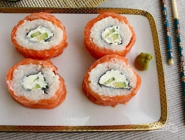 Ингредиенты: Лосось малосоленый — 300-350 Грамм. 1. Авокадо — 1/2 Штуки 2. Огурец свежий — 1/2 Штуки 3. Лист нори — 1-2 Штук 4. Сыр "Филадельфия" — 3 Ст. ложки 5. Рис — 0,5 Стакана 6. Рисовый уксус — 2 Ст. ложки 7. Сахар — 1 Ст. ложка 8. Соль — 1 Чайная ложка Тщательно промываем рис и ставим варить с 3/4 стакана воды. Доводим до кипения, уменьшаем огонь до минимума и варим под крышкой 15 минут. Выключаем огонь и оставим рис под крышкой еще на 10 минут. Не мешаем!!! Затем дадим рису немного остыть и добавим столовую ложку уксуса, сахар и соль и хорошо перемешиваем деревянной ложкой. Затем рис должен полностью остыть. Разрежем лист нори на две части. Смешаем в мисочке 1/3 стакана воды с ложкой уксуса и этим раствором смочите руки. Готовить суши будем на бамбуковом коврике, покрытом пищевой пленкой. Выкладываем на лист нори слой риса, оставляя 2 см внизу листа и выходя за край листа вверху на столько же. Переворачиваем нори с рисом, чтобы водоросли оказались сверху. Теперь выложим сливоч