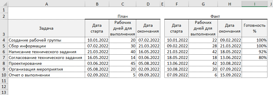 - в каждом блоке План и Факт должны быть следующие столбцы: дата старта, продолжительность в рабочих днях, дата окончания. Причем дату окончания можно посчитать, прибавив к дате старта количество рабочих дней при помощи функции РАБДЕНЬ.